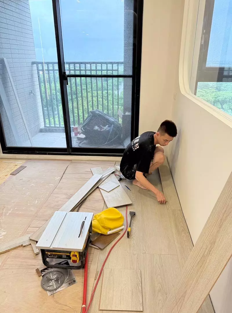 鋪設超耐磨地板現場施工圖。圖/唐選建材工程有限公司提供