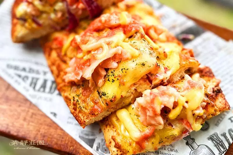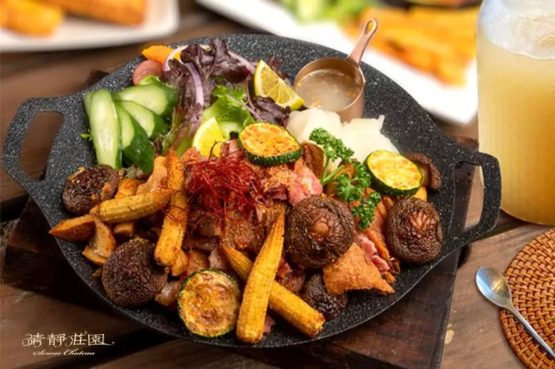 清靜莊園的料理結合都市餐廳的精緻工藝與山區食材的質樸風味,其中蜜糖金磚吐司系列由專業烘焙師每日現做,吐司烤至外酥內軟,淋上特製焦糖、花生、巧克力三種醬料,帶來層次豐富且濃郁的口感;獨家設計的長餅PIZZA系列,搭配特製松露醬、鮮蔬與濃郁起司,並推出燻鮭明太子、松露蕈菇和燻雞松露蕈菇等口味,適合與三五好友一同分享。