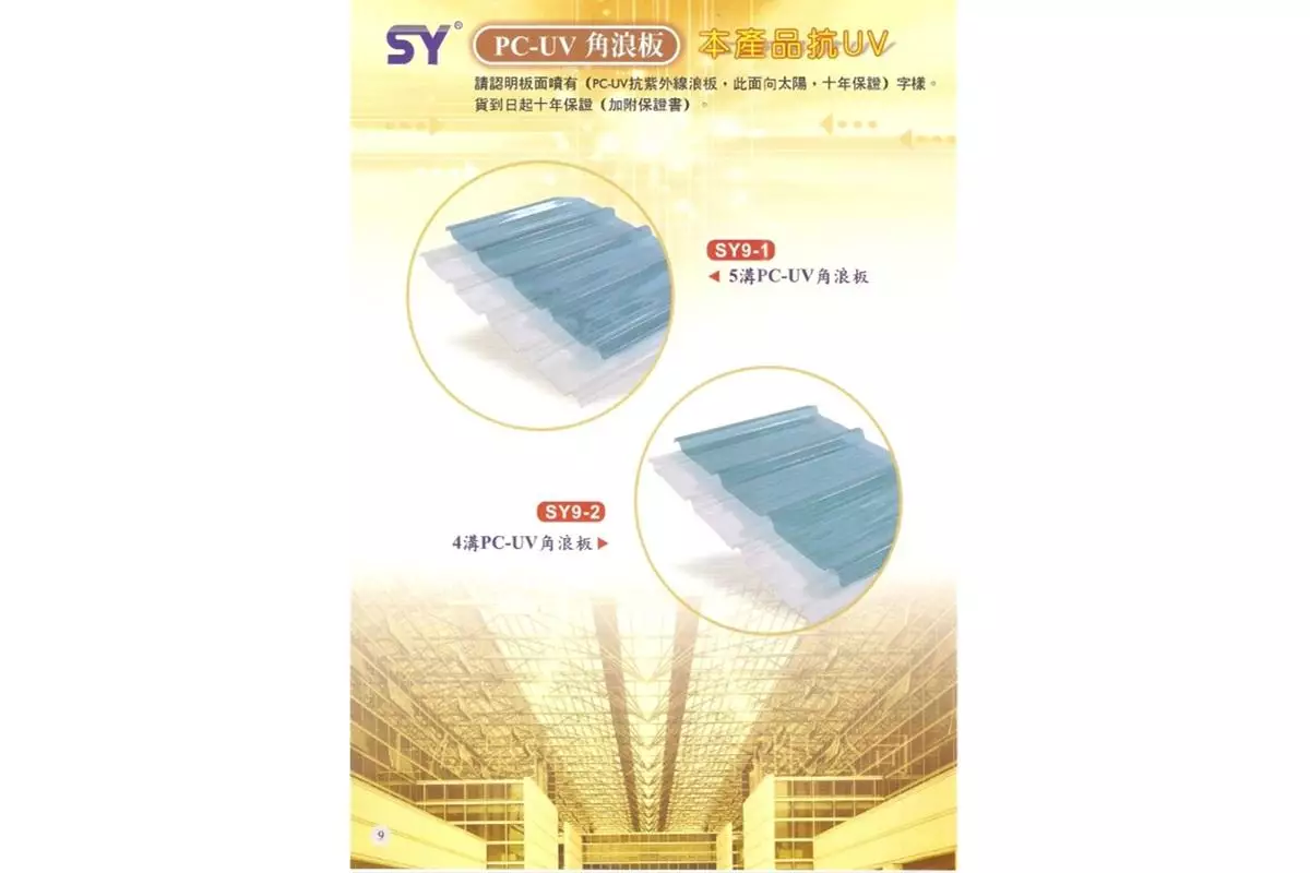 - PC-UV角浪板與大角浪壓片:耐衝擊、抗紫外線,適用於採光罩、天窗及戶外建築設施。