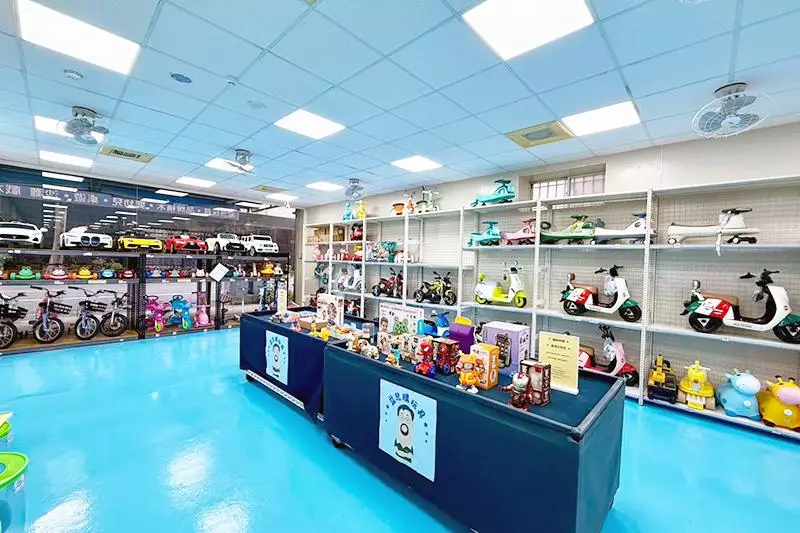 店內童車騎乘區&試玩體驗區花車。圖/益兒購玩具百貨提供