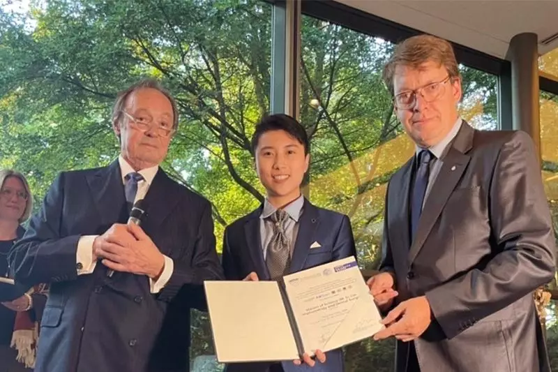 趙醫師獲頒德國植牙口腔外科碩士學位,與授證教授合影。圖/卉笑牙醫診所提供