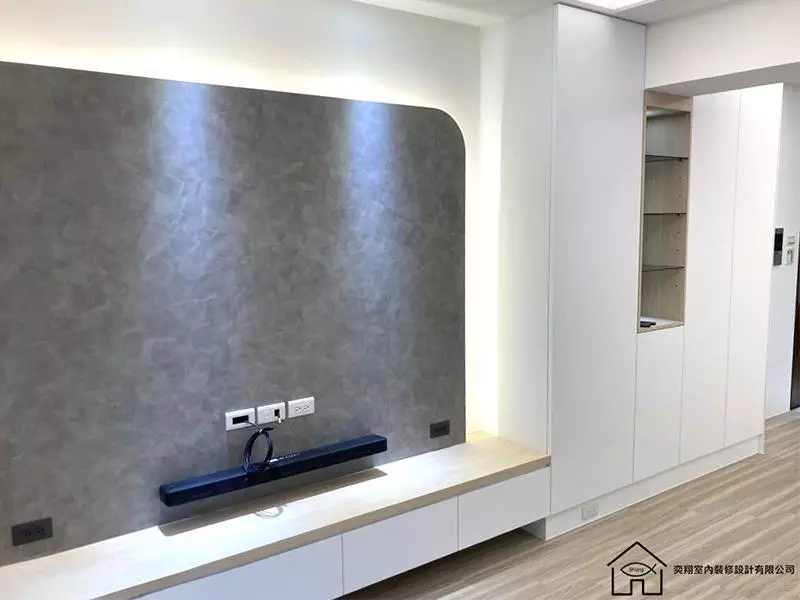 此案例中,屋主偏好具有質感又帶有特色的視覺效果,因此客廳主牆採用斯特曼特殊漆,並在背牆崁入LED燈條,增添立體層次;玄關延伸至電視牆的規劃則以白色系收納為主,形成乾淨視覺,並保留樑下展示櫃,方便屋主陳列榮譽勳章;公共空間運用間接照明搭配超耐磨木地板,營造室內溫潤氣氛,而玄關與廚房保留原有拋光石英磚,透過材質分區讓不同場域更具辨識度。