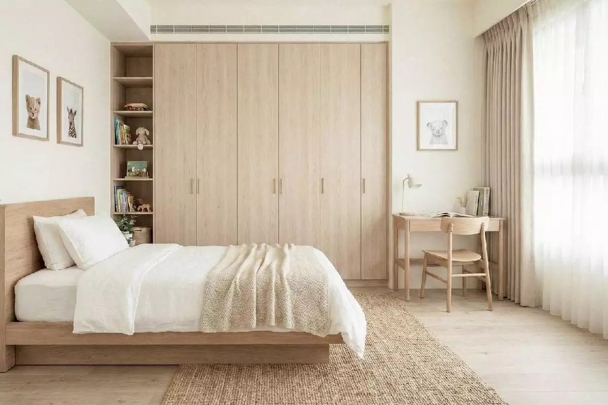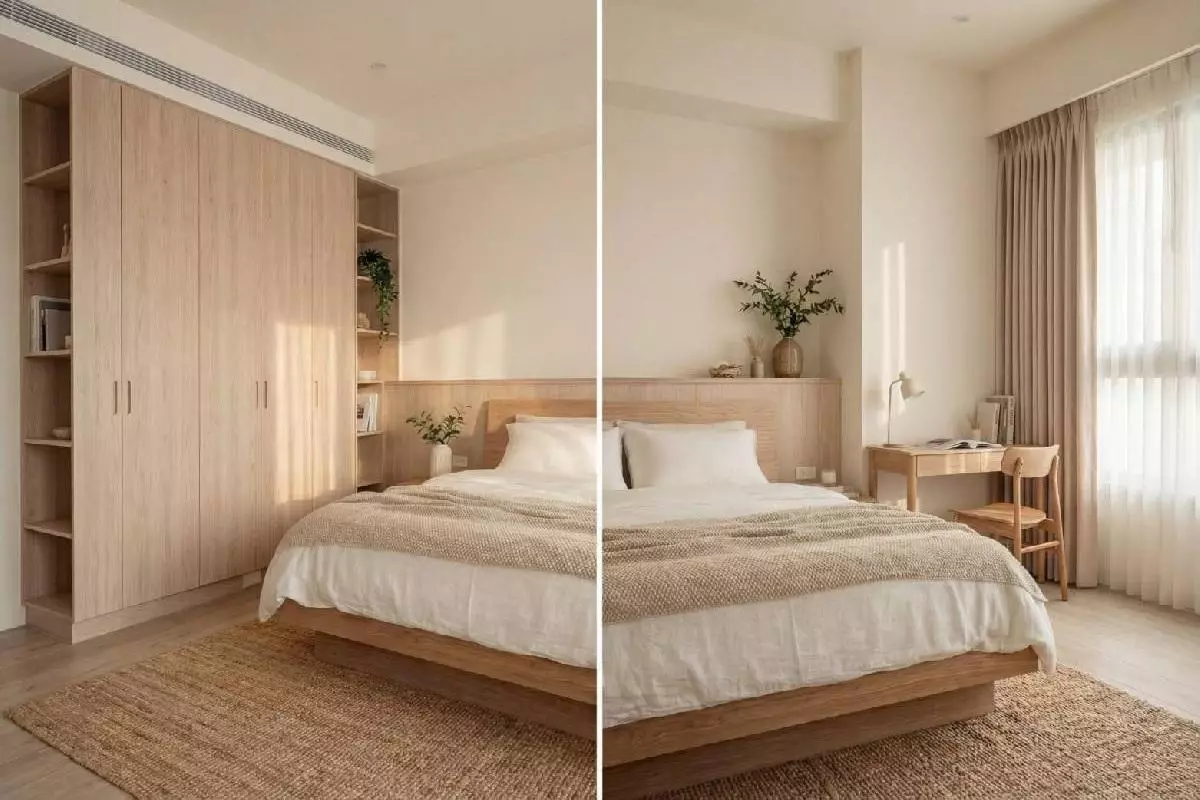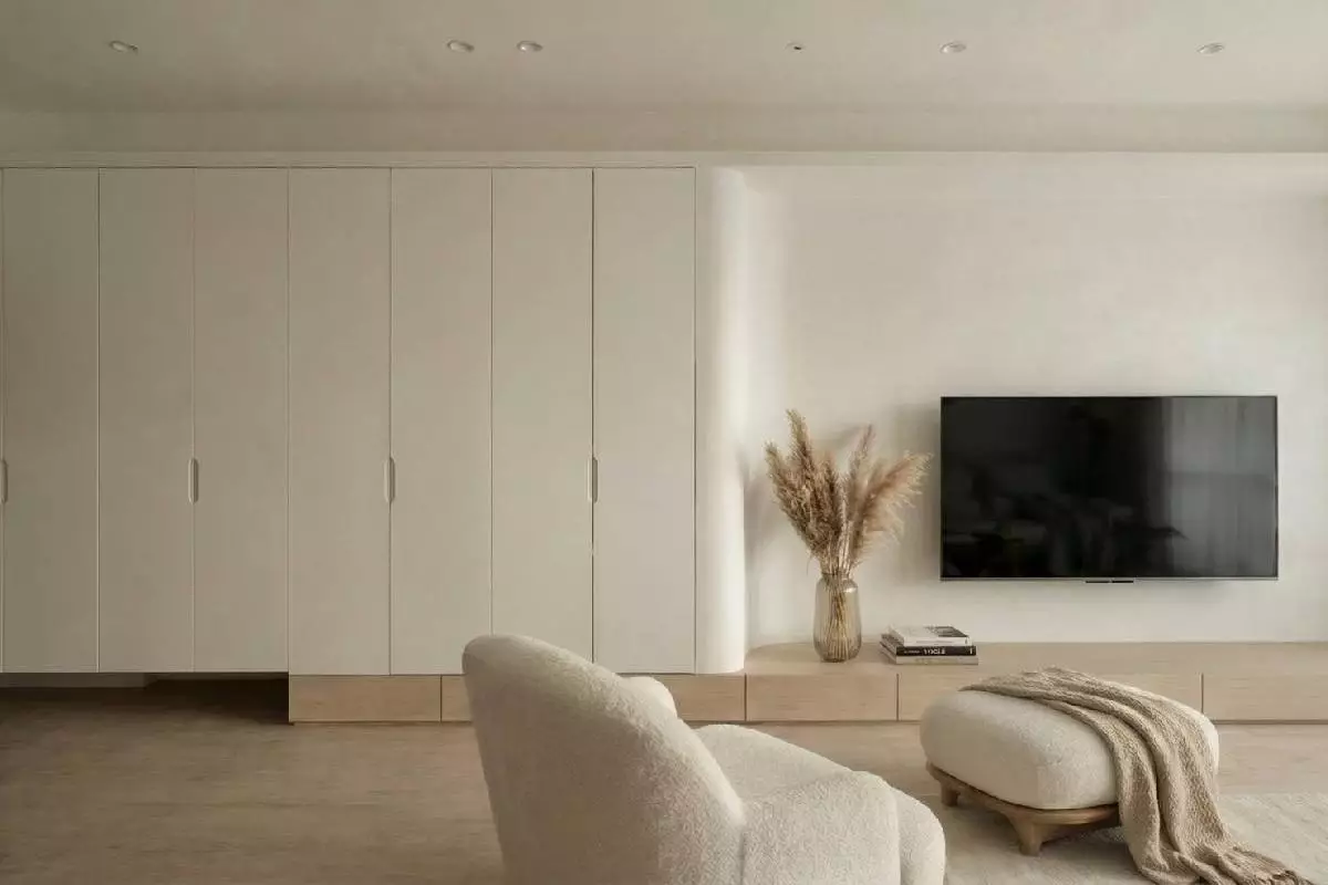 主臥室則以整面隱藏式衣櫃提升收納量,搭配木質梳妝桌與柔和燈光,營造沉靜療癒的休憩氛圍。整體設計在極簡與溫暖之間取得平衡,展現Japandi風格的自然與純粹。