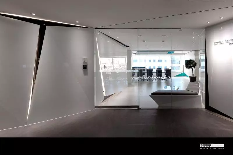 傳十設計曾服務位於新北市永和的「群正公司企業總部辦公室」,基地為出租型辦公大樓、面積約72坪,設計目標以符合企業精神的辦公空間為主軸,團隊將白淨時尚作為主要調性,入口牆面採內縮與切割手法,搭配黑色烤漆玻璃與間接燈光,隱喻業主產品「貼膜、保護殼」特性;會議室與主要辦公區延續入口的折線語彙,選用白色為底並加入藍綠色,創造呈現企業精神的視覺記憶點。